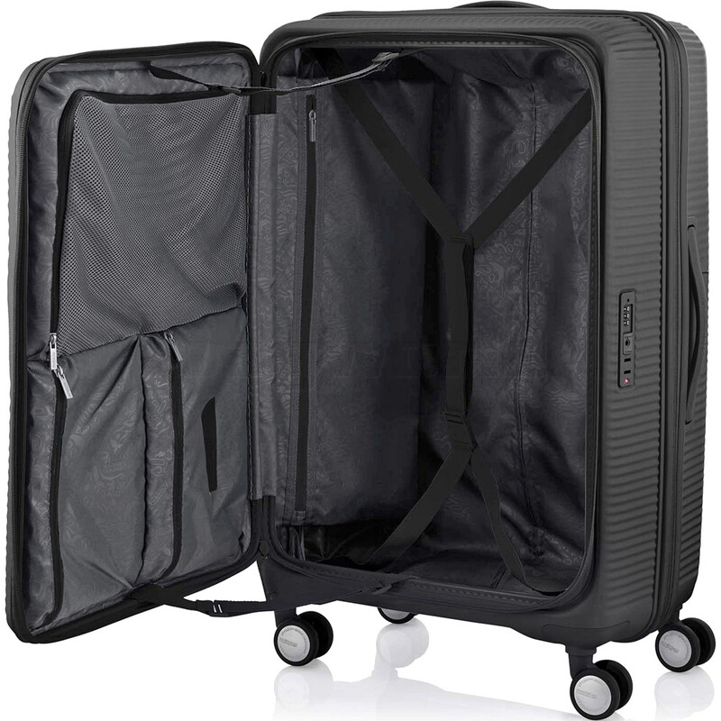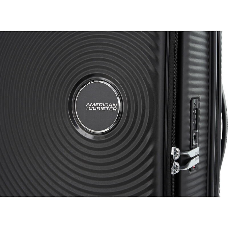Elevated design and function. American Tourister Curio Book Opening luggage combines the practicality of a soft case with the toughness of a hard case. It features huge packing volume with expandability in all sizes. The Duosaf ™ security zipper delivers top security, and the Optimov™ shock-absorbing wheels allow smooth rolling on bumpy surfaces. The recycled interior lining is treated with Microban® technology to eliminate the growth of bacteria.