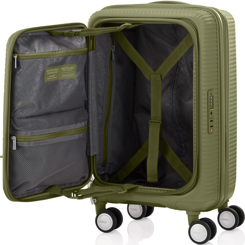 Elevated design and function. American Tourister Curio Book Opening luggage combines the practicality of a soft case with the toughness of a hard case. It features huge packing volume with expandability in all sizes. The Duosaf ™ security zipper delivers top security, and the Optimov™ shock-absorbing wheels allow smooth rolling on bumpy surfaces. The recycled interior lining is treated with Microban® technology to eliminate the growth of bacteria.