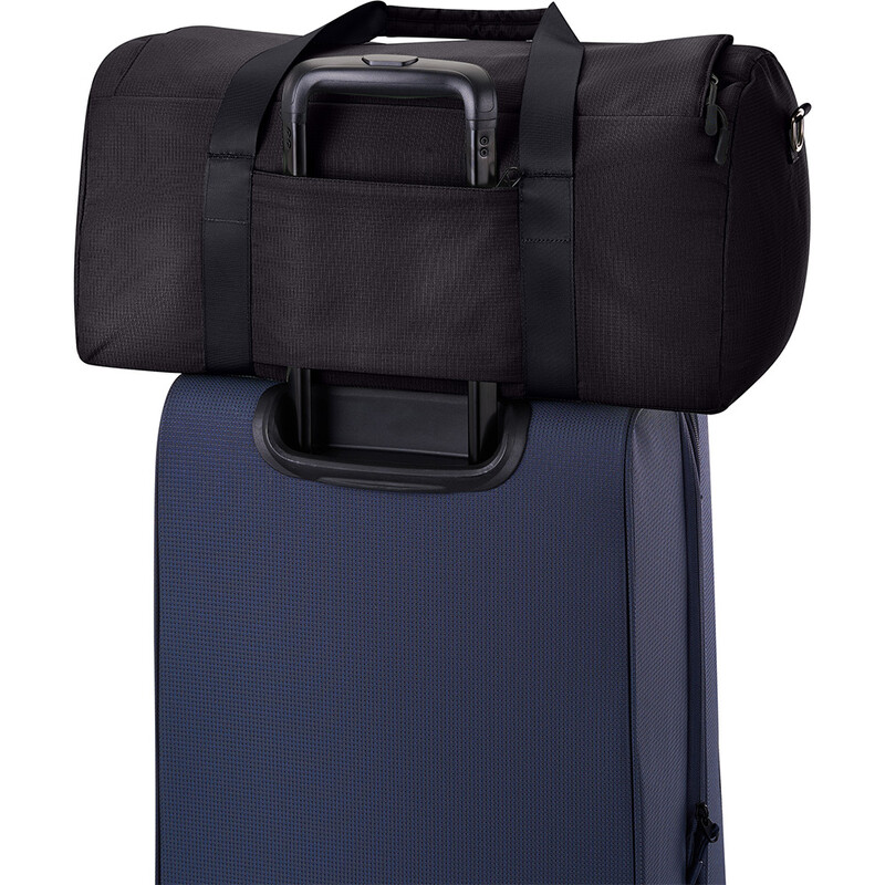 - Smart sleeve on rear slips over trolley handle for use with wheeled luggage