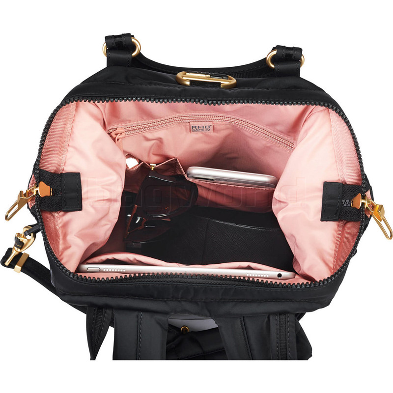 - eXomesh® slashguards – Front, bottom and side fabric body panels of the bag have built in stainless steel wire mesh panels