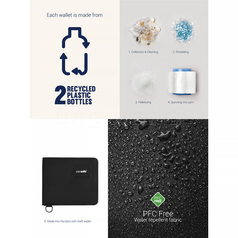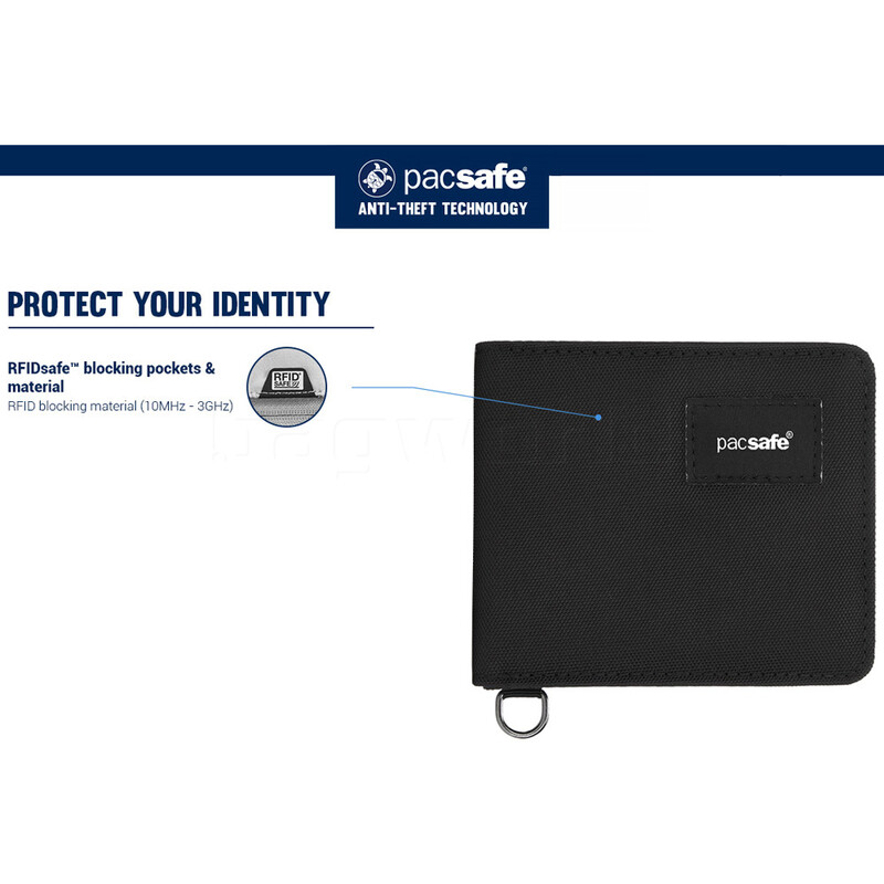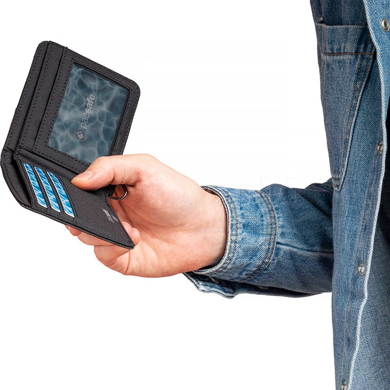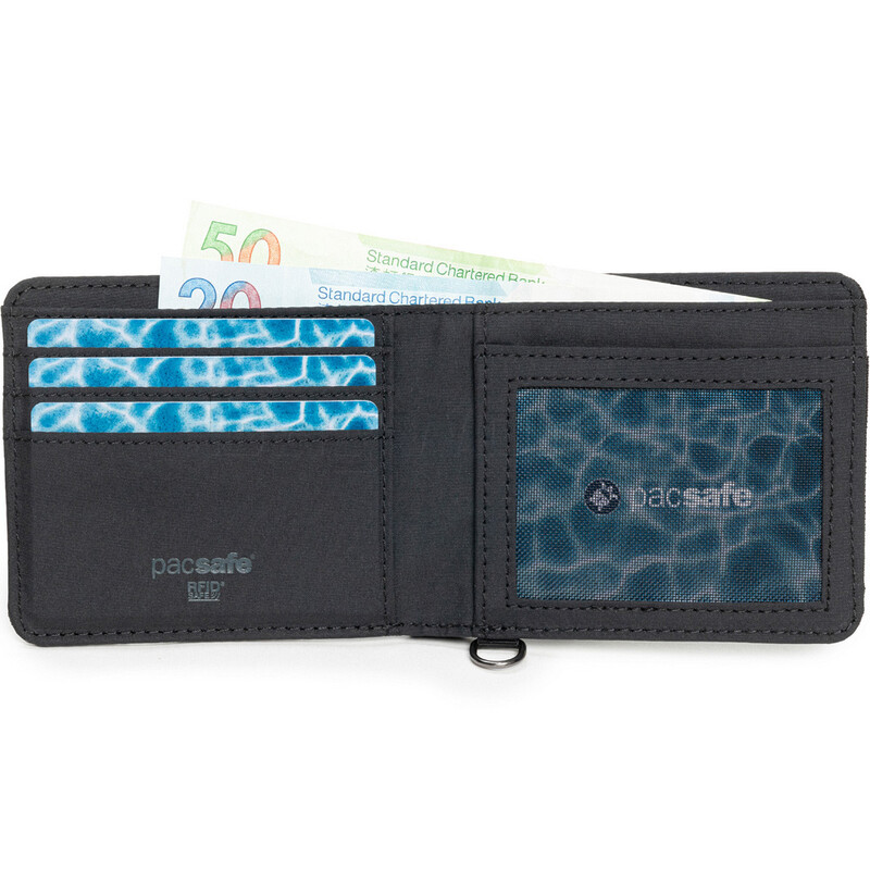 Sort your cards and cash in the slim RFIDsafe RFID Blocking Bi-Fold Wallet. This bifold wallet fits all currencies, has 3 credit cards slots plus an ID window. An attachment point for a cut-resistant strap (sold separately) allows for an added layer of protection.