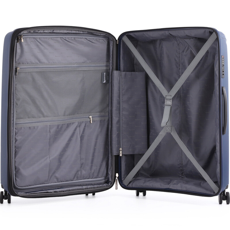 - Fully lined interior with adjustable packing straps, divider panel and 3 zip pockets
