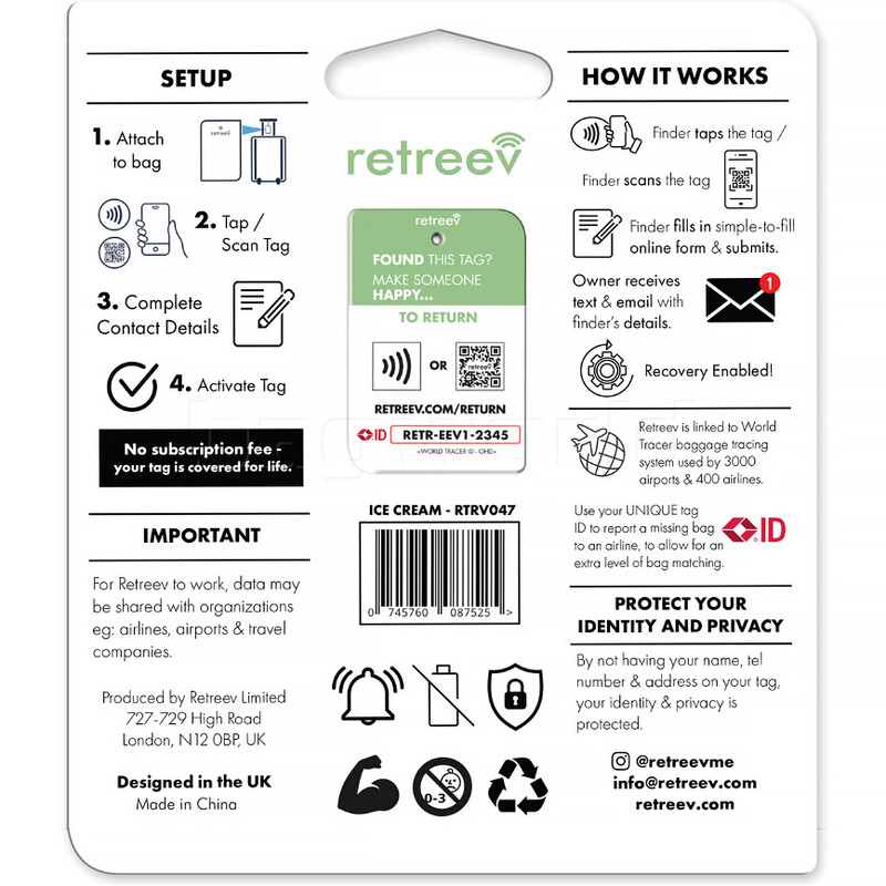 Retreev is the Smart Tag for your bag! Should a bag go missing, the Retreev Smart Tag will allow anyone to help get it back to its owner swiftly and securely. Identity theft is rising, and old baggage tags have your name, contact details and home address written in plain sight! No personal details are displayed on your Retreev tag. Every tag has a unique ID that is linked to a secure Retreev account. Made of reinforced stainless steel, a Retreev ring can withstand more than 50kg of force. The metal ring and eyelet have been engineered to keep the tag in place and attached to any bag, no matter what.