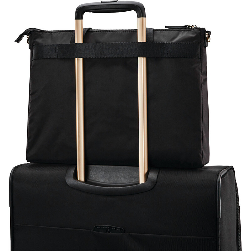 The Samsonite Mobile Solution range offers timeless style with a modern approach to function and organisation. Luxurious gold accent logos and zips elevate the collection. Slim and sophisticated, this multitasking brief offers a versatile alternative to the typical laptop bag. The SmartSleeve™ enables you to stack your bag on your suitcase for hassle-free travel.
