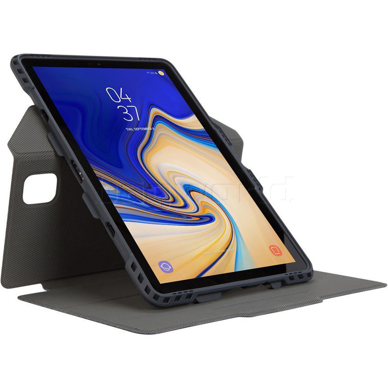 The Pro-Tek™ Rotating Case for the Samsung Galaxy Tab S4 10.5” (2018) delivers practical protection and adaptable good looks with Targus signature geometric Pro-Tek™ design. Rugged corners add impact protection. A custom-molded interior tray with enhanced corners defends against damage. The magnetic wrap closure secures and safeguards on-the-go. And, like other Targus cases, it offers military-grade protection for drops up to 4 feet*.