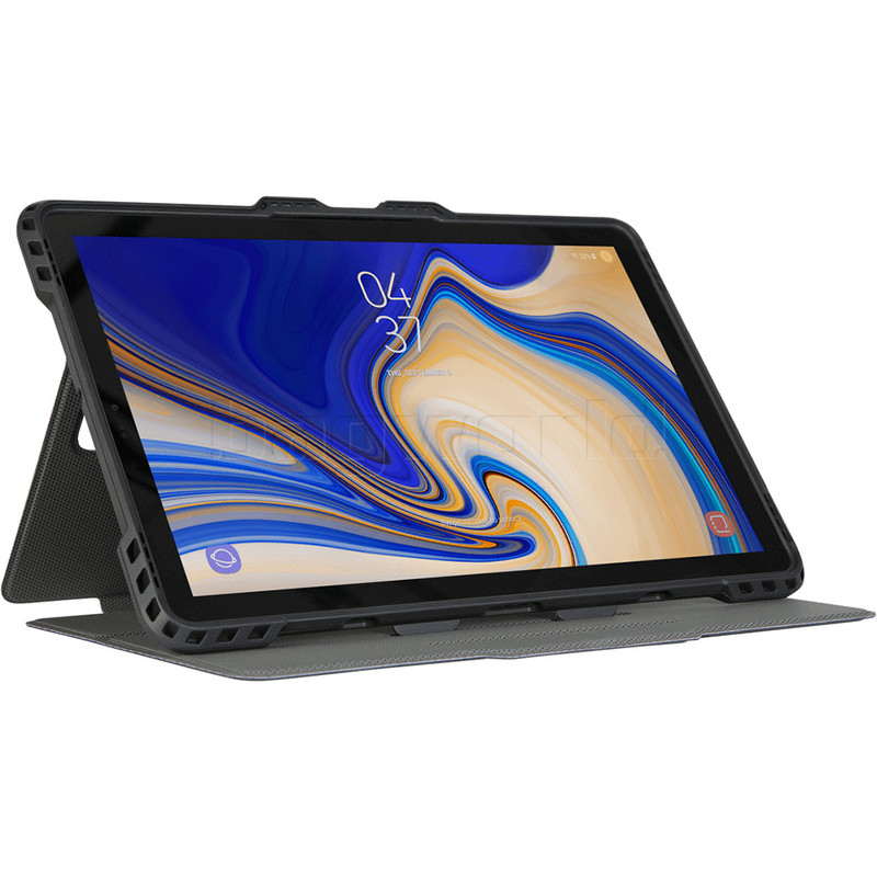 The Pro-Tek™ Rotating Case for the Samsung Galaxy Tab S4 10.5” (2018) delivers practical protection and adaptable good looks with Targus signature geometric Pro-Tek™ design. Rugged corners add impact protection. A custom-molded interior tray with enhanced corners defends against damage. The magnetic wrap closure secures and safeguards on-the-go. And, like other Targus cases, it offers military-grade protection for drops up to 4 feet*.