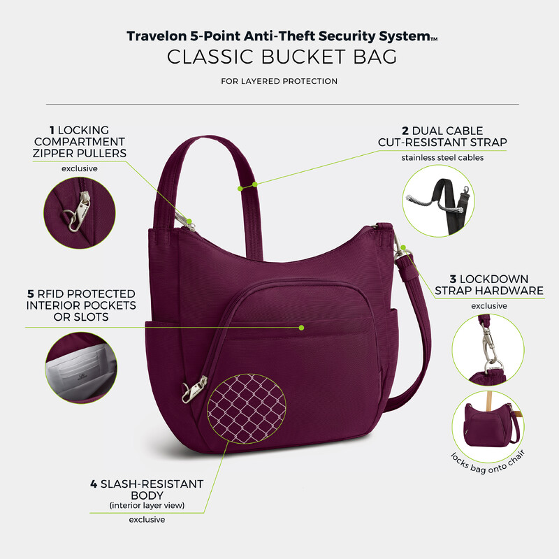 Travelon Classic Anti-Theft Crossbody Bucket Bag Burgundy 42757 - ORDER NOW FOR DELIVERY IN MAY 2026