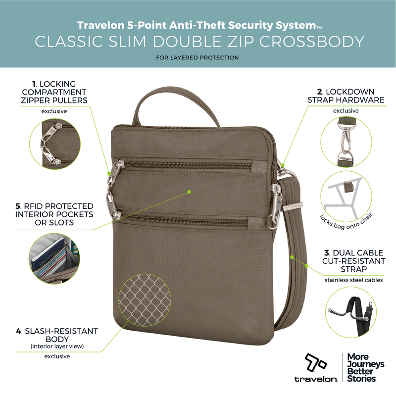 Main features of the Travelon Classic Anti-Theft Slim Double Zip Crossbody Bag include: