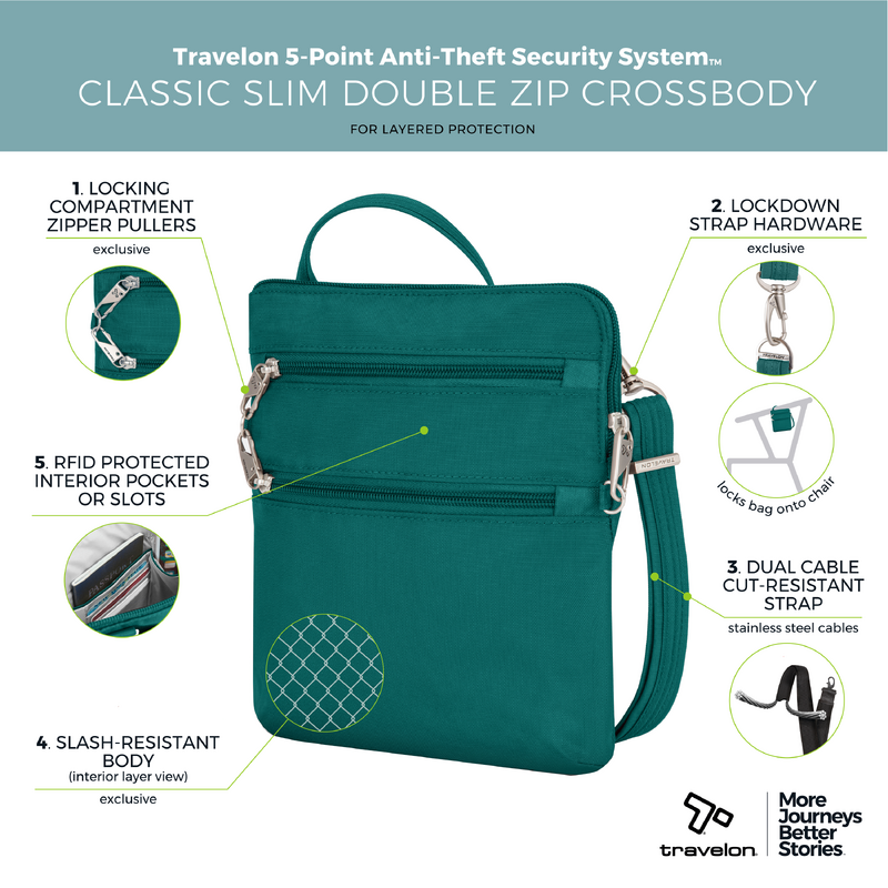 Main features of the Travelon Classic Anti-Theft Slim Double Zip Crossbody Bag include: