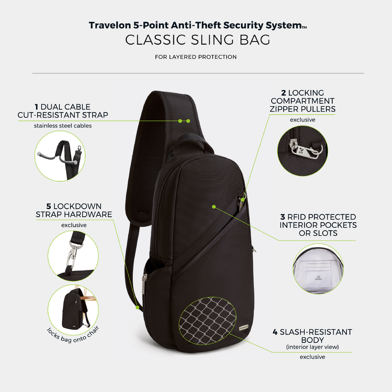 Main features of the Travelon Classic Anti-Theft Sling Bag include:
