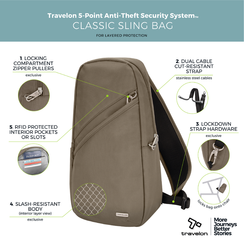 Main features of the Travelon Classic Anti-Theft Sling Bag include: