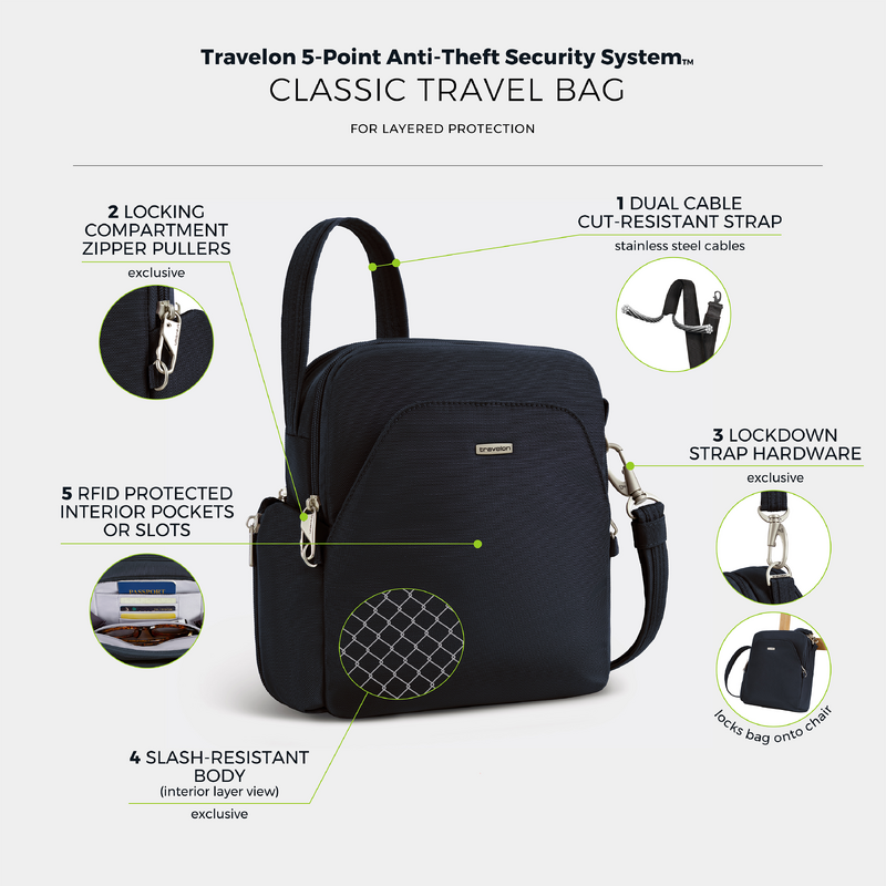 Main features of the Travelon Classic Anti-Theft Travel Bag include: