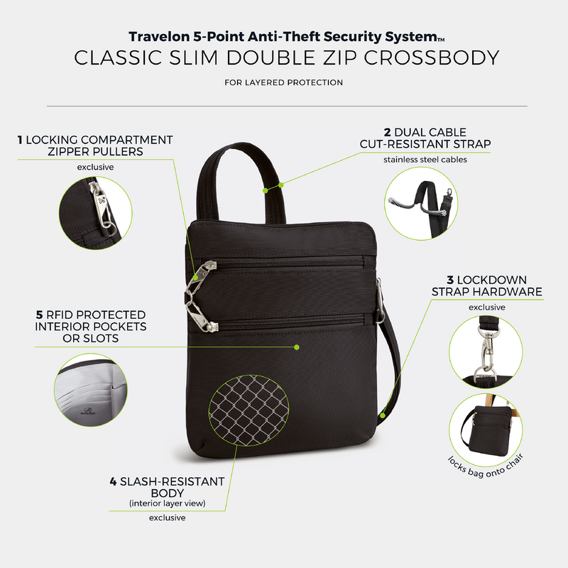 Main features of the Travelon Classic Anti-Theft Slim Double Zip Crossbody Bag include: