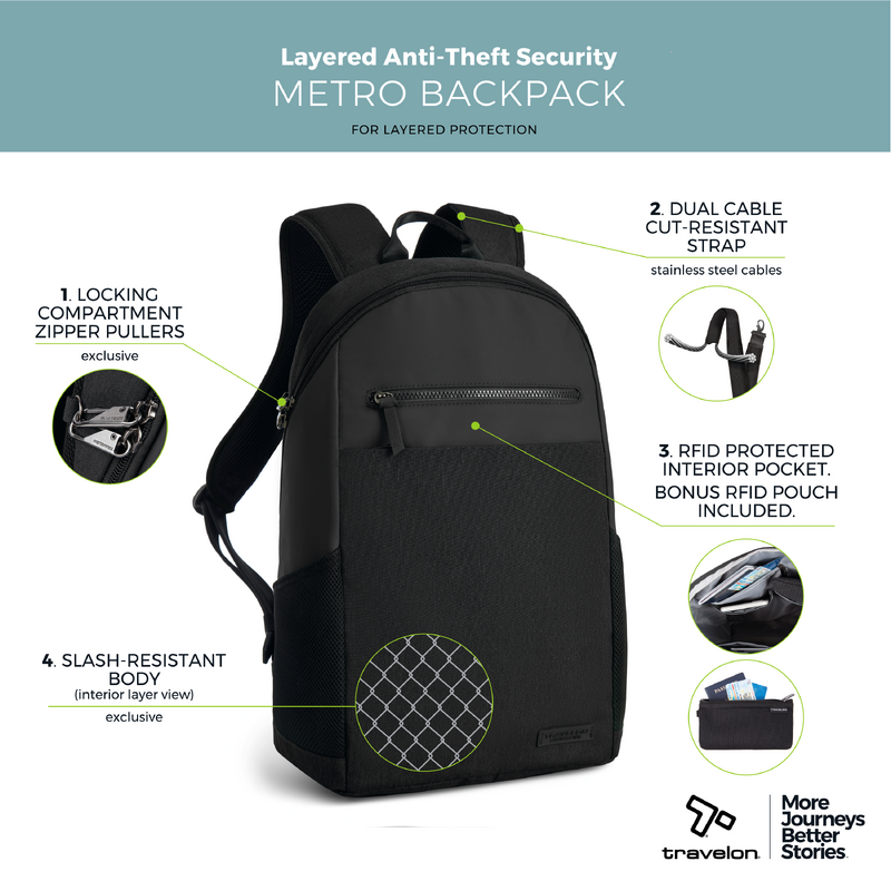 Main features of the Travelon Metro Anti-Theft 15.6” Laptop & Tablet Backpack include: