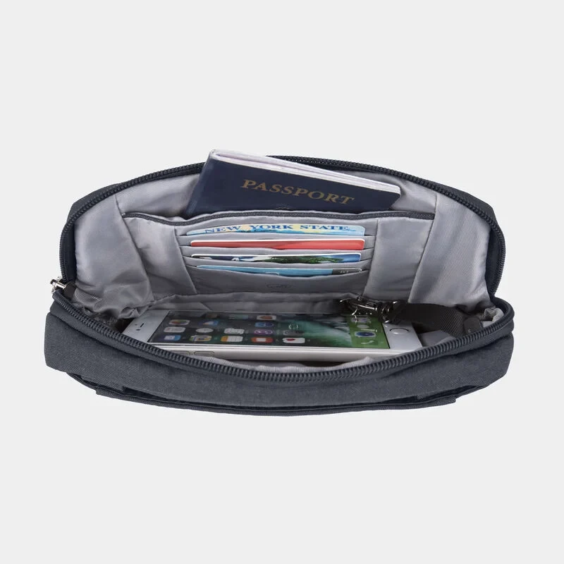 - Zipper clip locking feature on main compartment with RFID blocking card and passport slots