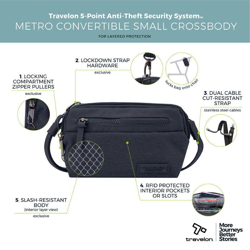 Main features of the Travelon Metro Anti-Theft Convertible Small Crossbody Bag include: