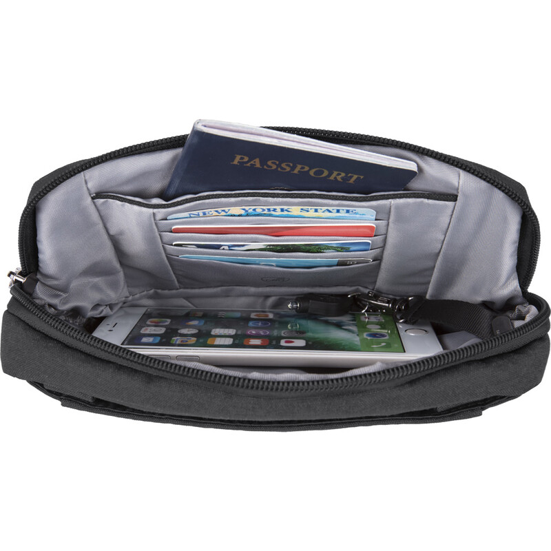 - Zipper clip locking feature on main compartment with RFID blocking card and passport slots