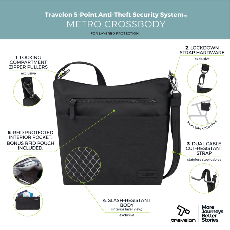 Main features of the Travelon Metro Anti-Theft Crossbody Bag include: