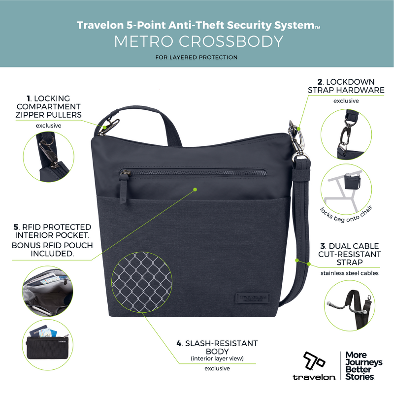 Main features of the Travelon Metro Anti-Theft Crossbody Bag include: