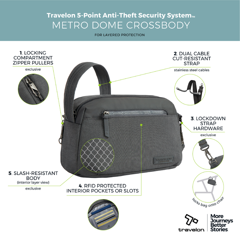 Main features of the Travelon Metro Anti-Theft Dome Crossbody Bag include: