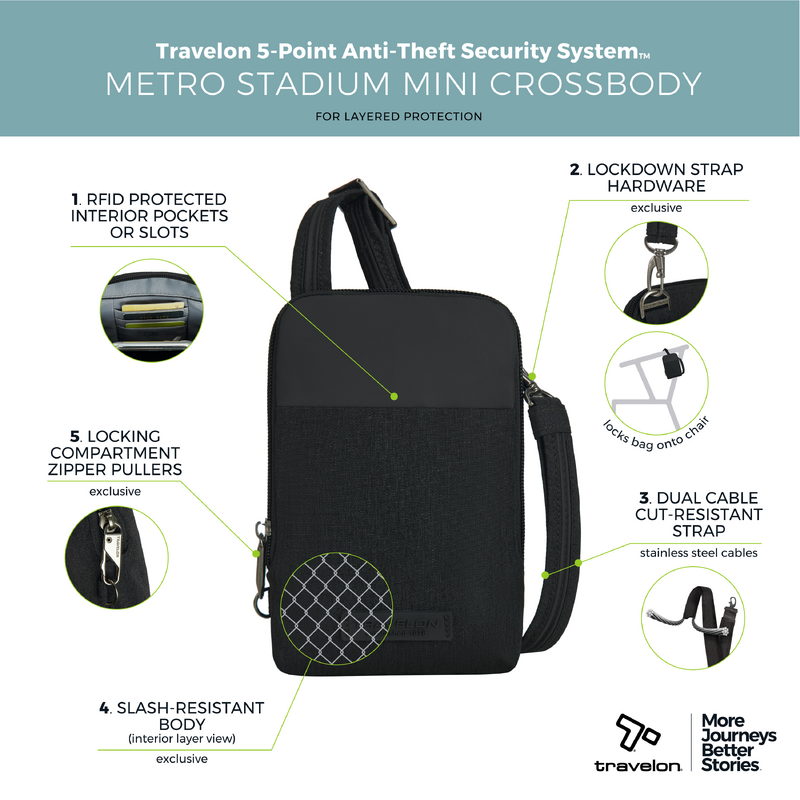 Main features of the Travelon Metro Anti-Theft Stadium Mini Crossbody Bag include:
