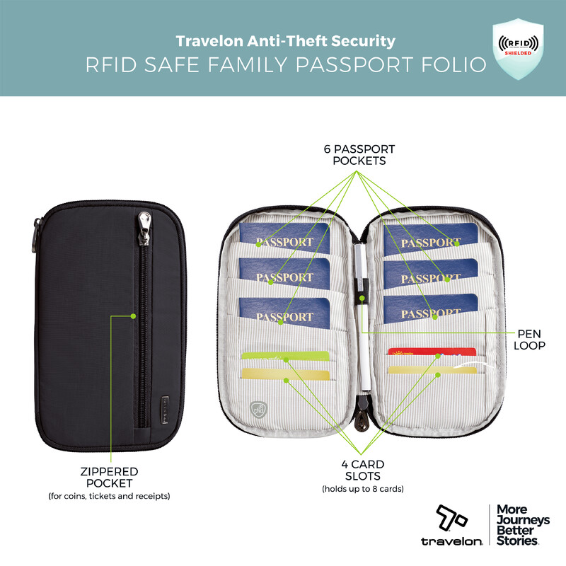 Main features of the Travelon RFID Blocking Family Passport Wallet include: