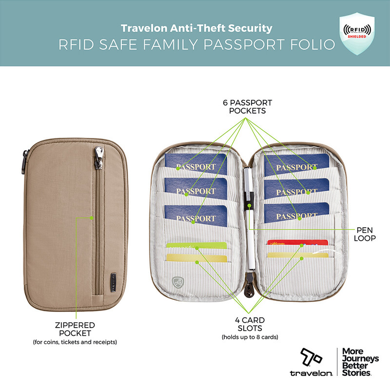 Main features of the Travelon RFID Blocking Family Passport Wallet include: