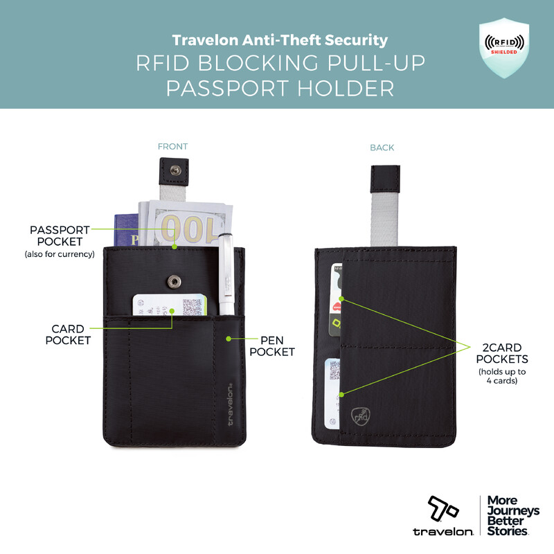 Main features of the Travelon RFID Blocking Pull-Up Passport Holder include: