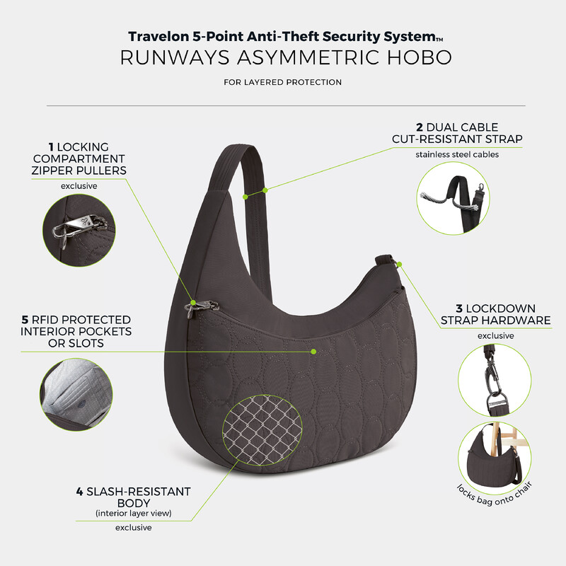 Main features of the Travelon Runways Anti-Theft Asymmetric Hobo Bag include:
