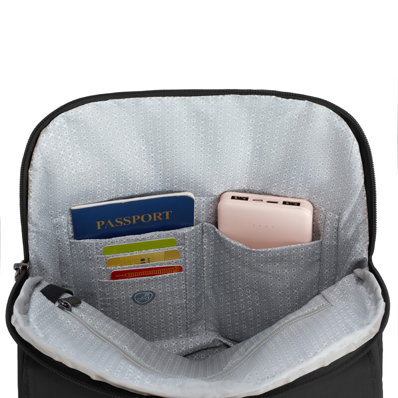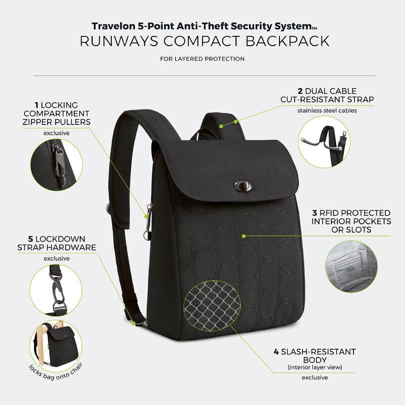 Main features of the Travelon Runways Anti-Theft Compact Backpack include: