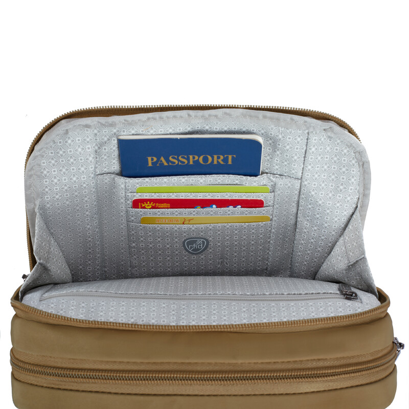 - Front compartment organisational panel with RFID blocking card slots, RFID blocking passport pocket & small zippered pocket