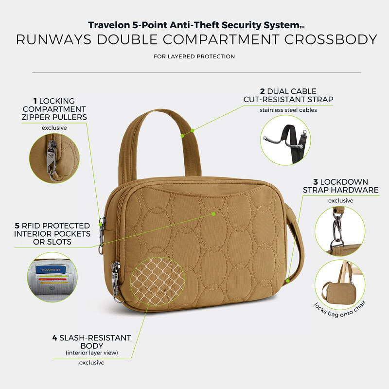 Main features of the Travelon Runways Anti-Theft Double Compartment Crossbody include: