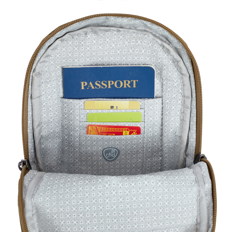 - Generous main compartment with drop pocket, RFID blocking card slots and RFID blocking passport pocket
