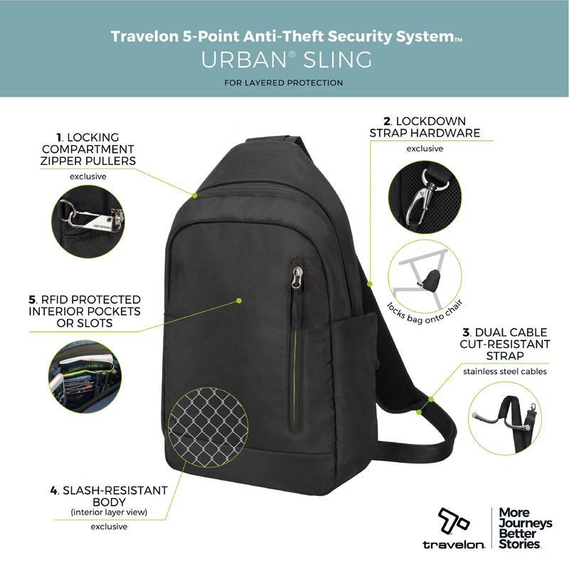 Main features of the Travelon Urban Anti-Theft Sling Bag include: